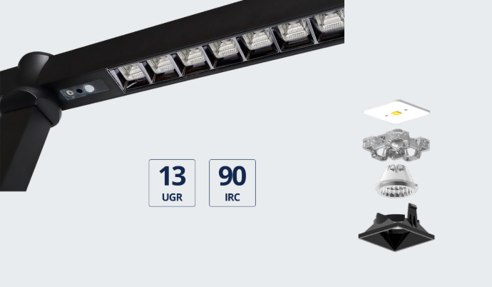 Grâce à un UGR inférieur à 13, ces luminaires garantissent un éclairage sans éblouissement, respectant les normes les plus strictes en matière de confort visuel. La technologie driver 0 flicker élimine toute pulsation lumineuse, assurant ainsi une lumière stable, sans scintillement. De plus, un indice de rendu des couleurs (IRC) supérieur à 90 permet une restitution fidèle et naturelle des couleurs, rendant l’environnement de travail non seulement plus agréable, mais aussi plus productif.