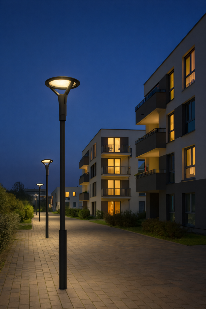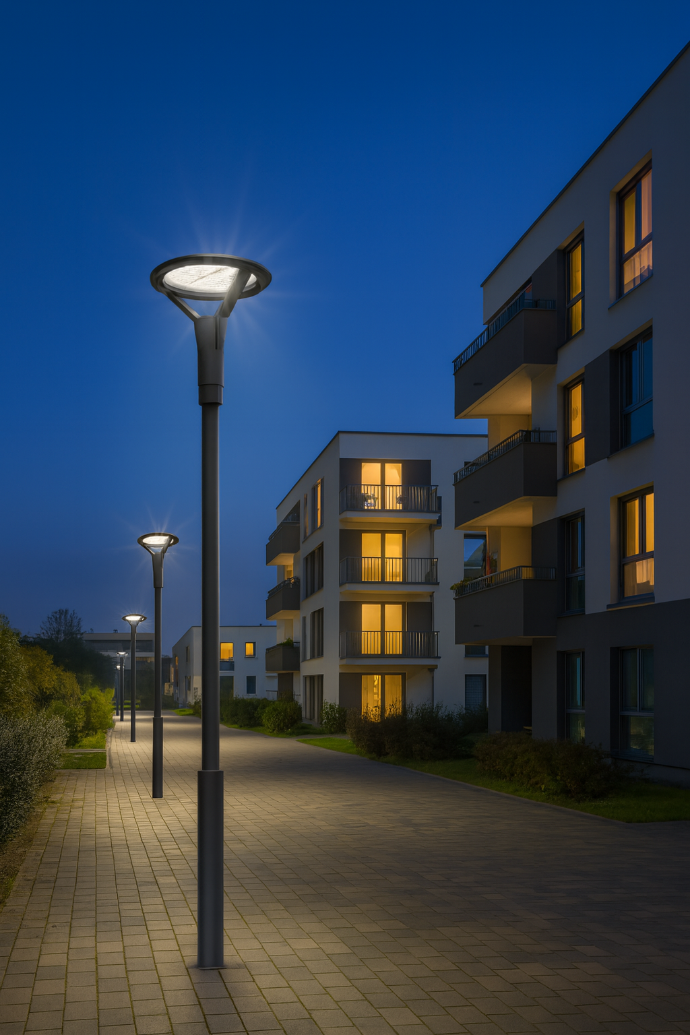 Streetlights LED au design architectural contemporain, idéals pour l’éclairage des berges, chemins piétons, cours, jardins extérieurs, parcs, résidences et squares.