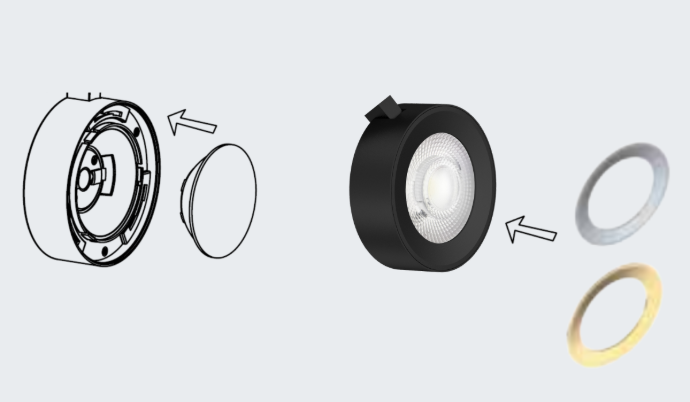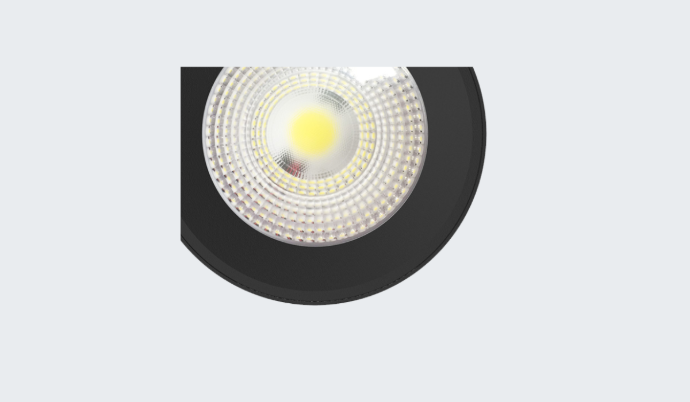 L’anneau interne, livré en coloris noir assorti au spot, peut être proposé en finition dorée ou argentée sur projet, pour une intégration esthétique soignée et différenciante.