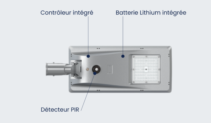 Chaque luminaire intègre un panneau photovoltaïque en silicium microcristallin, une batterie Lithium LiFePO4, ainsi qu’un driver/contrôleur intelligent MPPT capable d’ajuster dynamiquement l’intensité lumineuse en fonction du cycle jour/nuit.