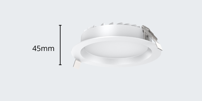 Avec une hauteur totale réduite à seulement 45 mm, ces downlights LED sont spécialement conçus pour les installations à faible plénum et les plafonds avec espace technique limité.