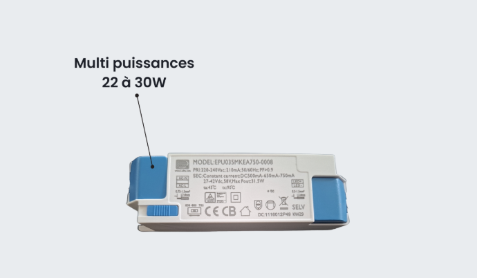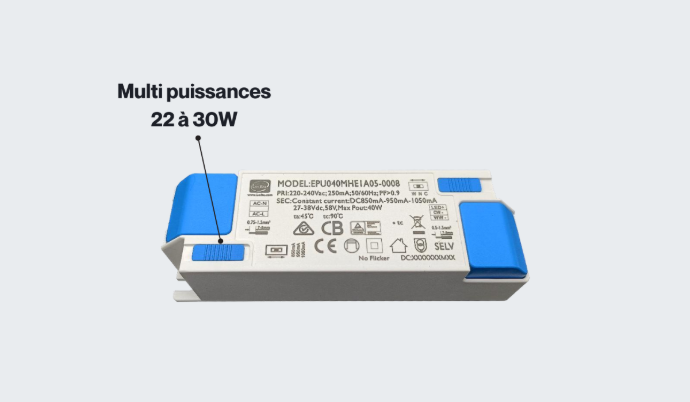Ces dalles sont équipées d’un driver à puissance réglable permettant d’ajuster la consommation entre 22 W et 30 W. Cette fonctionnalité offre une flexibilité maximale pour adapter le flux lumineux aux besoins réels de chaque espace, tout en contribuant à optimiser la performance énergétique.