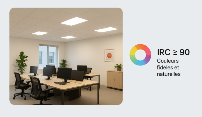 Cette haute qualité de rendu des couleurs contribue à un confort visuel supérieur et à une perception plus juste des espaces, essentielle dans les environnements de travail, d’accueil ou de soins.