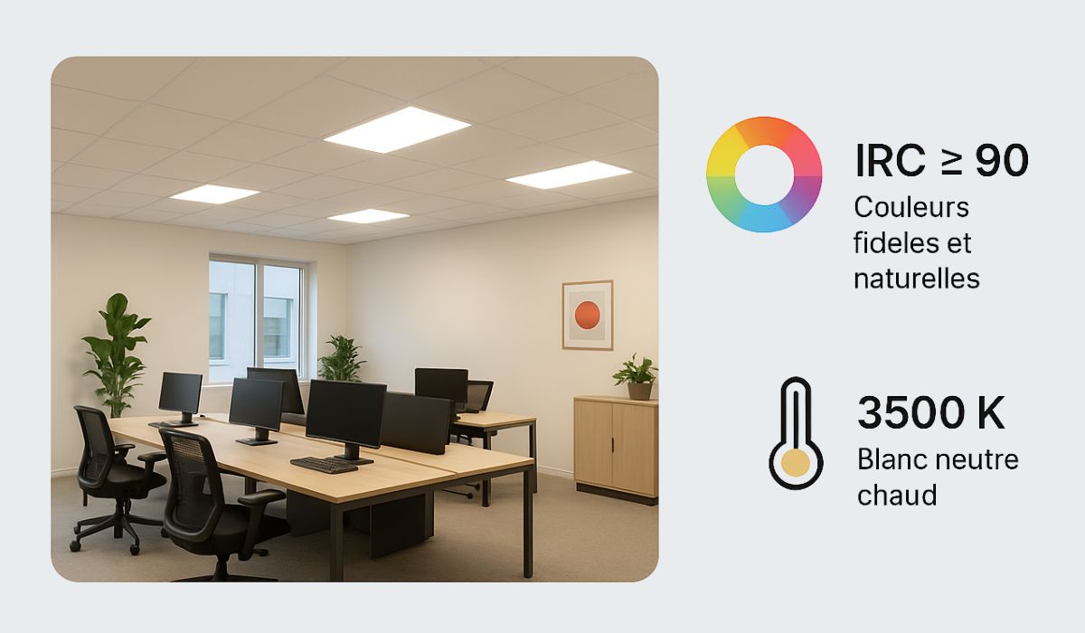 Cette qualité de rendu exceptionnelle assure un confort visuel supérieur et une perception plus juste des espaces, essentielle dans les environnements de travail, d’accueil ou de soins.