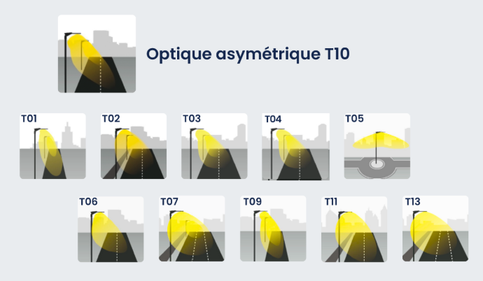 Les luminaires sont livrés en standard avec une optique asymétrique T10 semi-circulaire, parfaitement adaptée à l’éclairage des abords de bâtiments et des parkings.