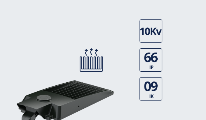 Une protection contre les surtensions jusqu’à 10 kV, associée à une valve de régulation de pression et à une dissipation thermique optimisée par ailettes supérieures, contribue à préserver durablement les performances des LED et la fiabilité de l’installation.